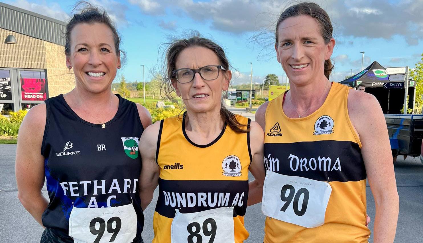 The first three women to finish in the County Novice B Road Championships held at Fethard Town Park on Saturday night last: From leftto right: Barbara Ryan Fethard AC, Catherine Fogarty Moyne AC and Karen Coughlan Dundrum AC.