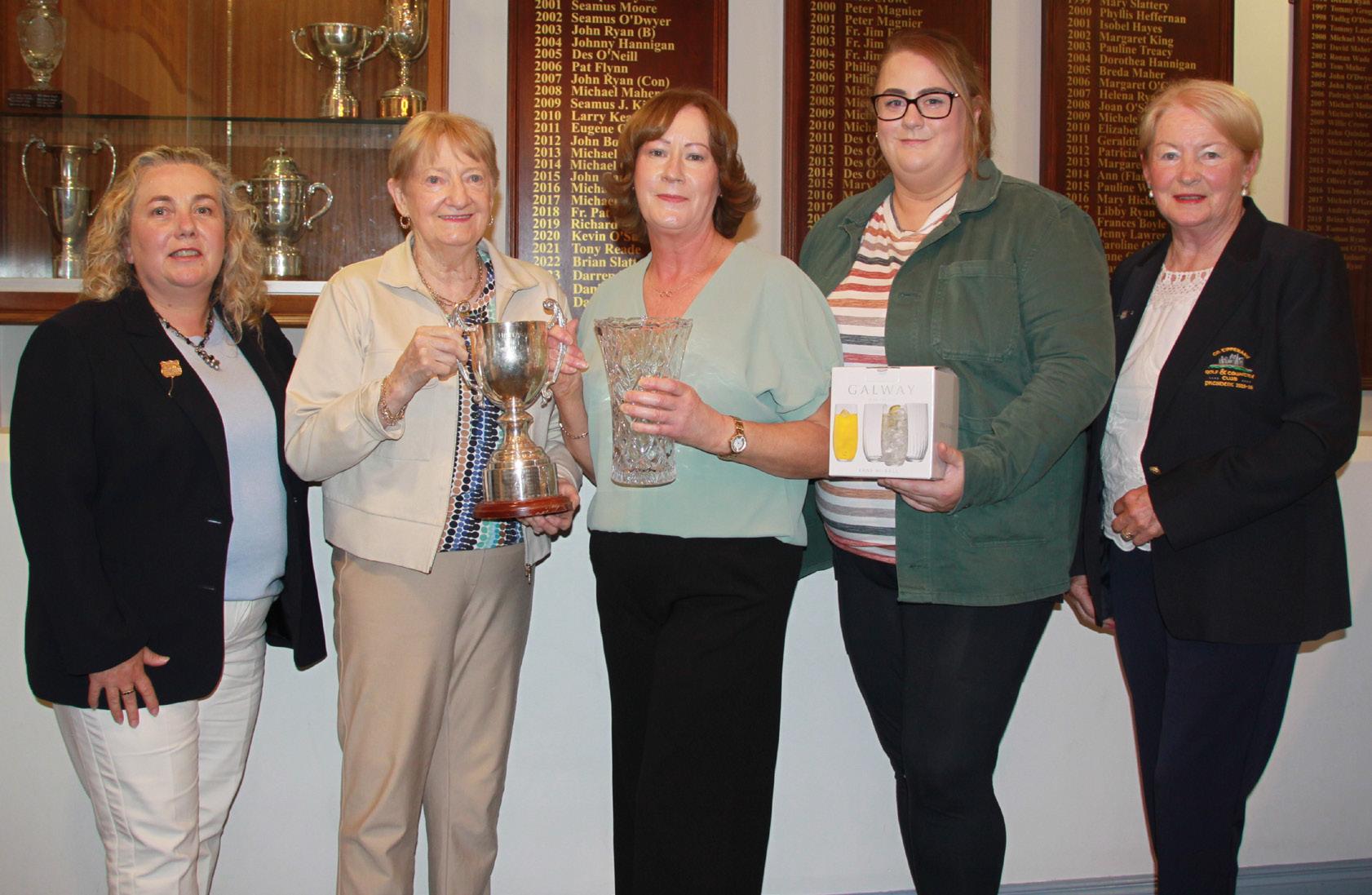 Left to Right Lady Captain Marie Graves, Phyllis Heffernan McGuire (sponsor), Carmel Lowth (winner), Sheena Ryan (Best Gross) AND President Jenny Lawrence.