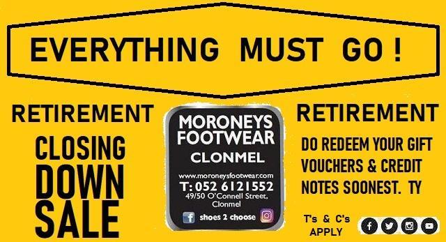 Moroney’s Footwear in O’Connell Street, Clonmel have announced that they have commenced their final retirement (closing down) clearance sale which will continue over the coming weeks.
