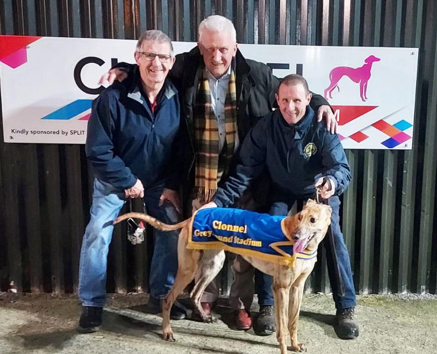 Clonmel’s Pat Egan took the second race with Purple Cashout who picked off the two leaders on the run-in when clocking 29.80. 92 year-old Johnny Barrett from Mitchelstown, always a very prominent supporter of Clonmel Greyhound Stadium, pulled off the opening sprint with Free Hunter who has been absent from the winner’s podium for quite a while but dominant this sprint in 16.60.