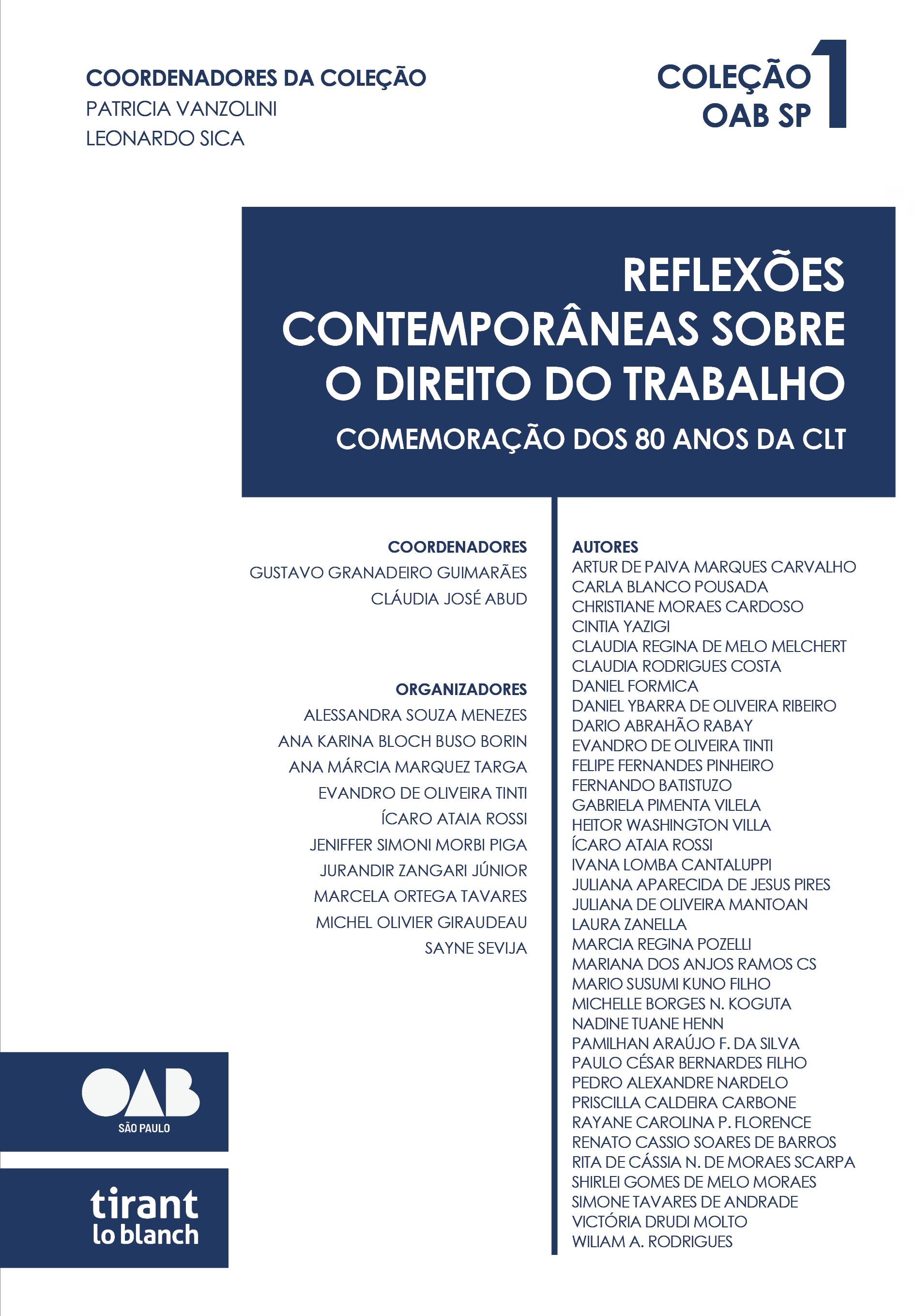 Reflexões contemporâneas sobre o direito do trabalho : comemoração dos 80 anos da CLT [livro eletrônico] / Artur de Paiva Marques Carvalho ... [et. al.]; Alessandra Souza Menezes ... [et. al.] (org.); Patricia Vanzolini ... [et. al.] (coord.); prefácio Gustavo Granadeiro Guimarães, Cláudia José Abud. -1.ed. – São Paulo : Tirant lo Blanch, 2023. (Coleção OAB SP)
