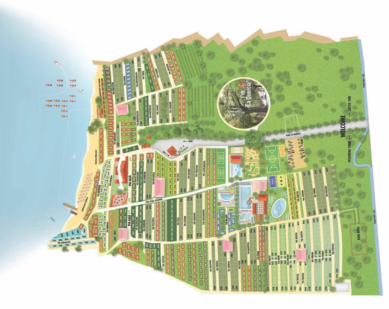 – Lago: piazzole al lago da nr. 1–24 e 35–47, corrente 10 A, acqua e scarico acque, 100 ,2m Wi-Fi.