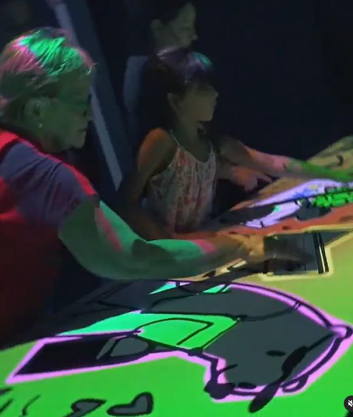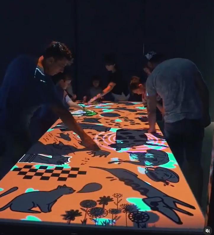 El segundo juego, concebido para grupos, presenta una mesa circular dividida en secciones, cada una con una categoría diferente relacionada con figuras culturales e históricas. Los participantes deben adivinar la respuesta a través de botones interactivos. La sincronización precisa activa una luz central, proporcionando una retroalimentación visual inmediata y fomentando la participación activa.