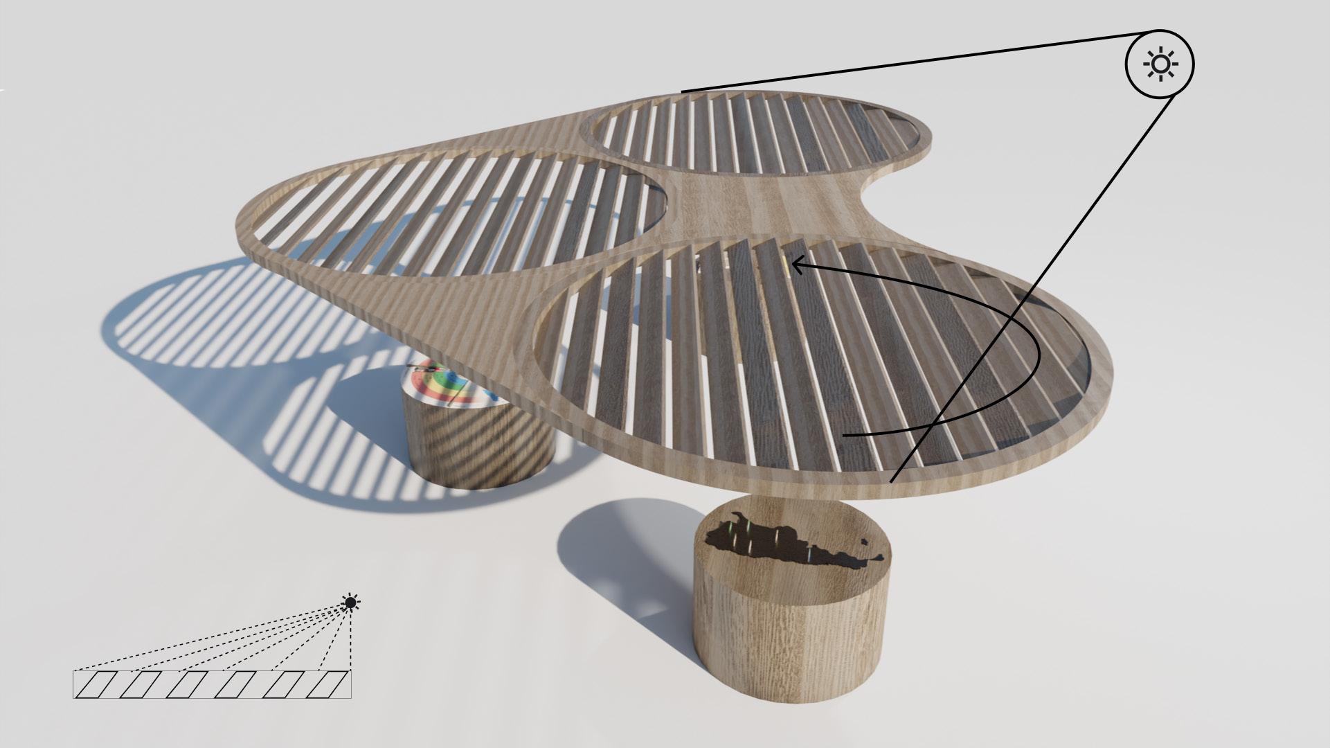 El proyecto busca representar la diversidad geográfica y cultural del país. Con ese objetivo, en términos de material, se investigó sobre distintas maderas de árboles autóctonos de cada una de las regiones del país. Con estas, se fabricarían varillas de perfil trapezoidal y se construirían paneles curvos.