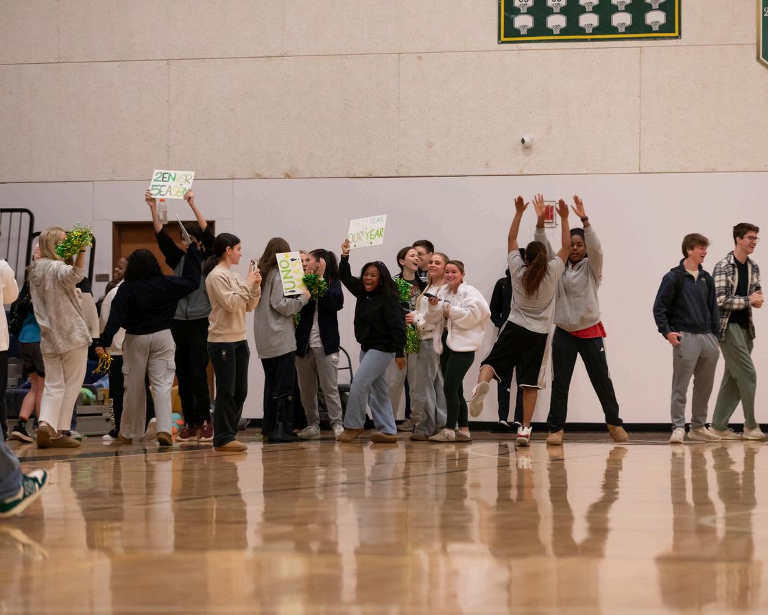 Clockwisefromtop:SeniorscompetewithaBeyoncestyleactinthelipsyncbattle.ChloeCato’27represents thesophomoresinblindfoldedmusicalchairs.Members oftheseniorclasscelebrateanother2025win.