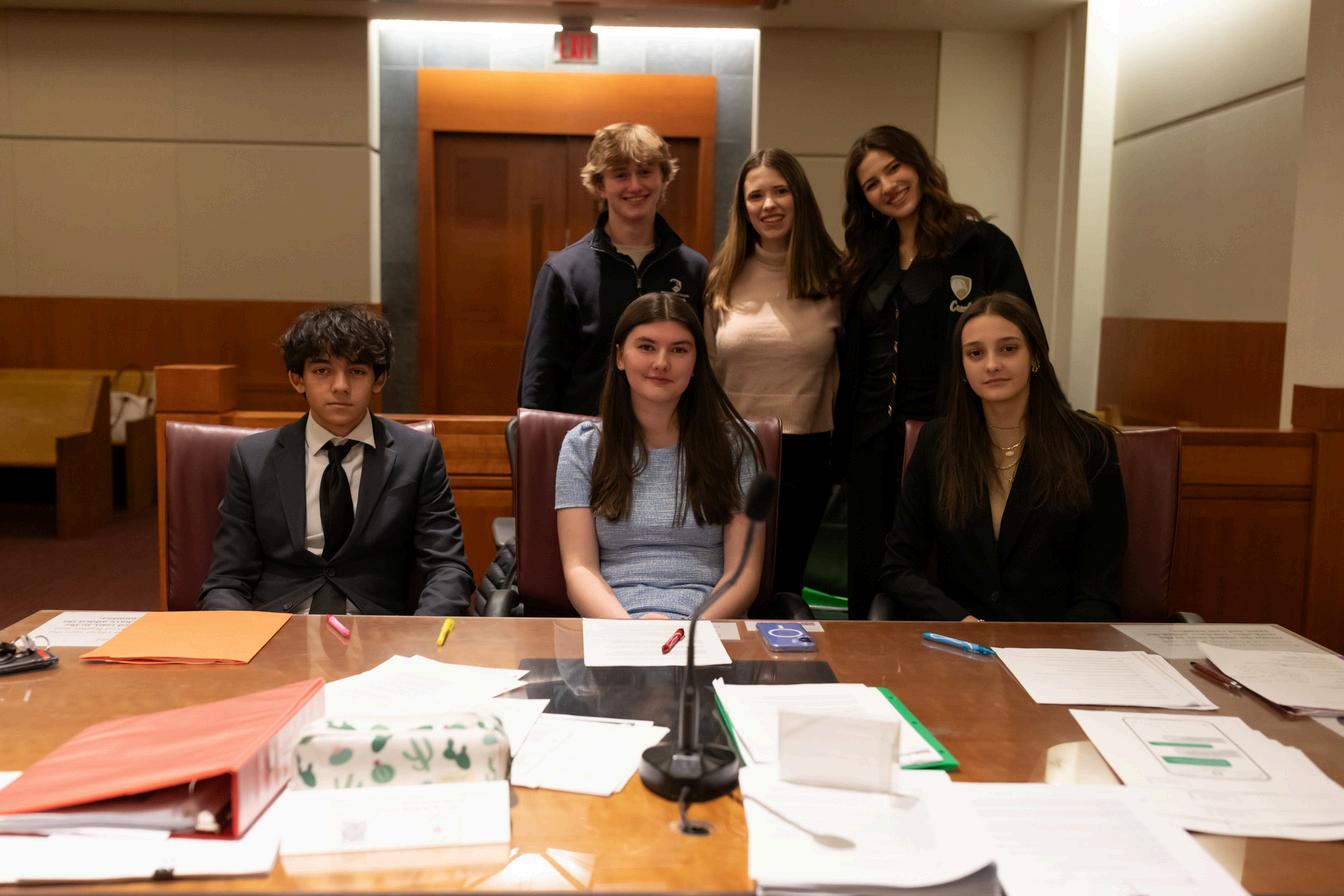 TheUpperSchoolMockTrialteampreparesforcourt. L-R:JaviMina-Vega’25,ConorMastromarco’25,SophiaO’Connell’25, SophieGeismar’25,IzzyPardo’26andCaseyRoth’28;