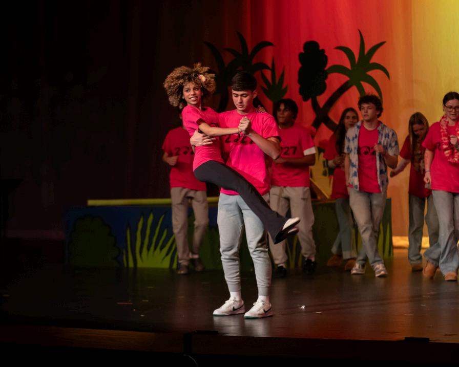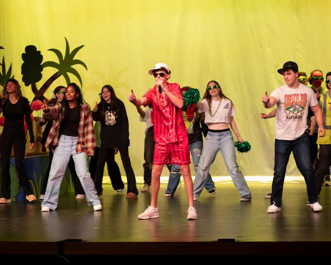 SophomoresMitchellMontgomery,CarolineShenck,DannyCasteel,Nola McKenna,AndrewGrizzell,AbbyHerman,andBrodySmithcompetefortheClass of2027inthemattressrollchallenge.Below:Thisyear’sLipSyncbattle performanceswerehighlycompetitive.