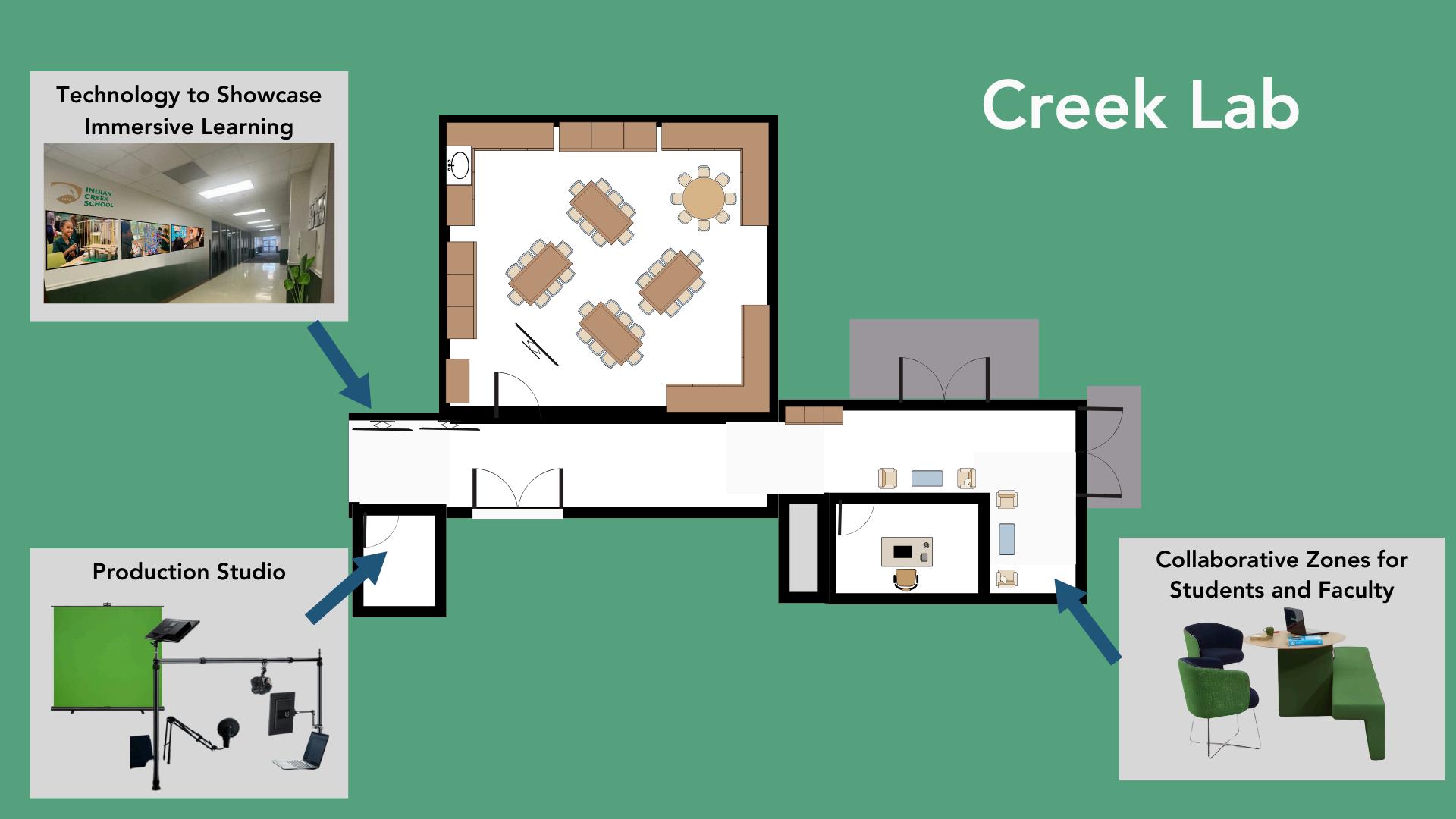 The learning will expand outside of the Creek Lab space into the hallway space creating the Creek Studio. Through intentionally designed collaboration zones, state-of-the-art digital interactive displays to showcase learning, a production studio, and curated collections of student work, the hallway and corner space of the building will be reimagined to be a hub for students and faculty