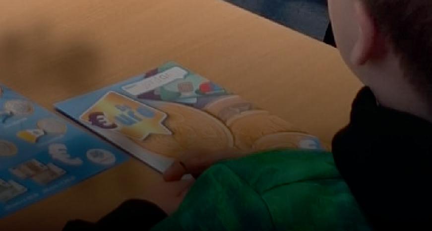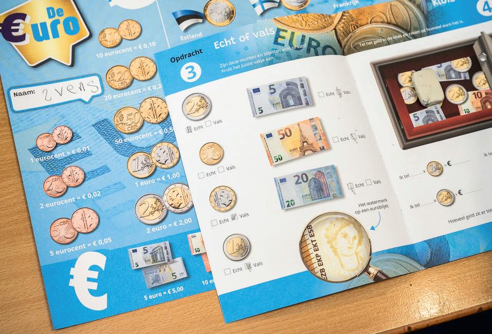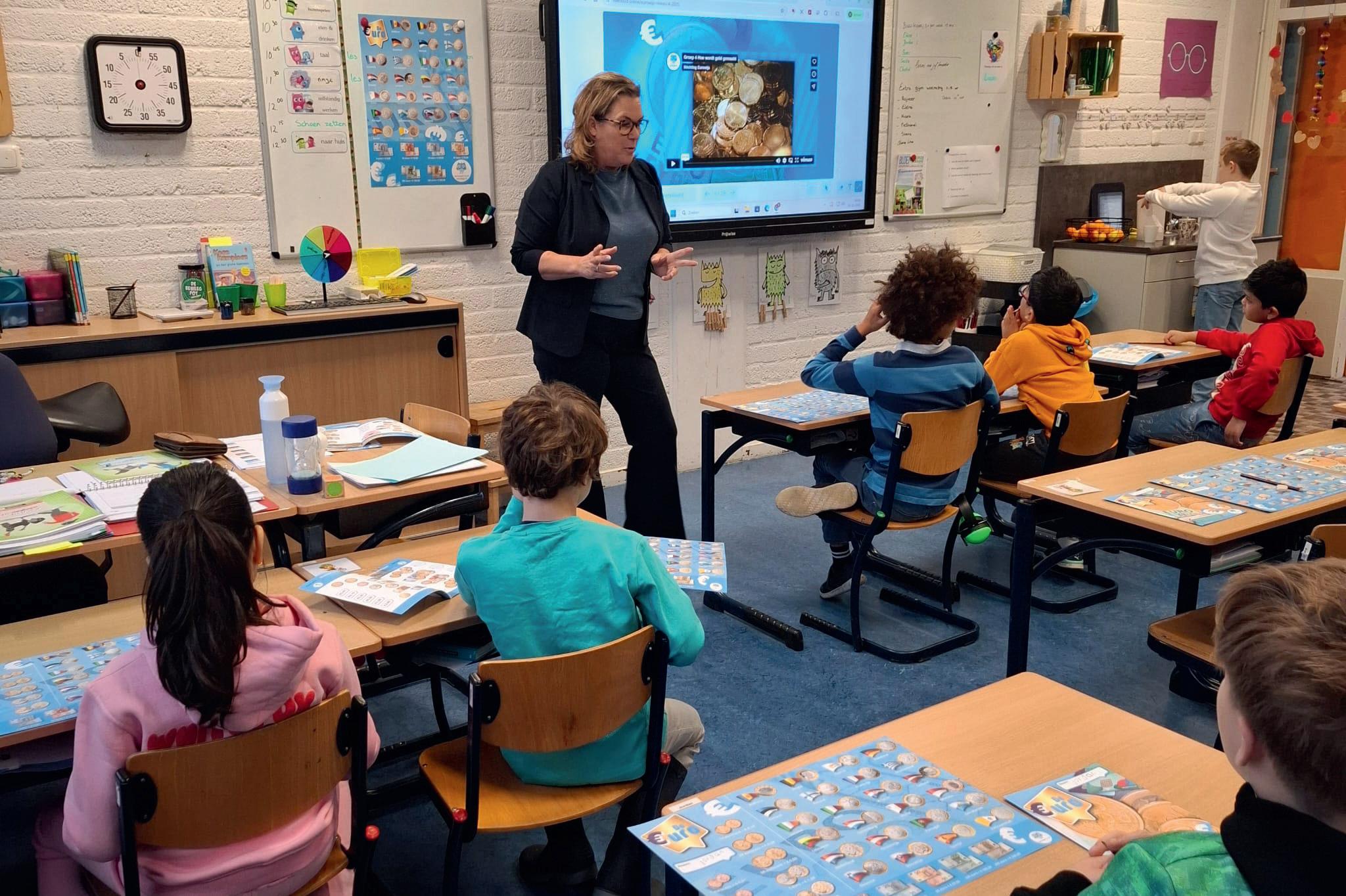 Voor de klas staat Hilde Krens van Stichting Eurowijs. Zij legt leerlingen vragen voor die dichtbij hun dagelijkse leven liggen. Hoe betaal je in een winkel? Wat is het verschil tussen contant geld en pinnen? En hoe zie je of een briefje echt is? Het zijn vragen die uitnodigen tot meedenken en onderzoeken.