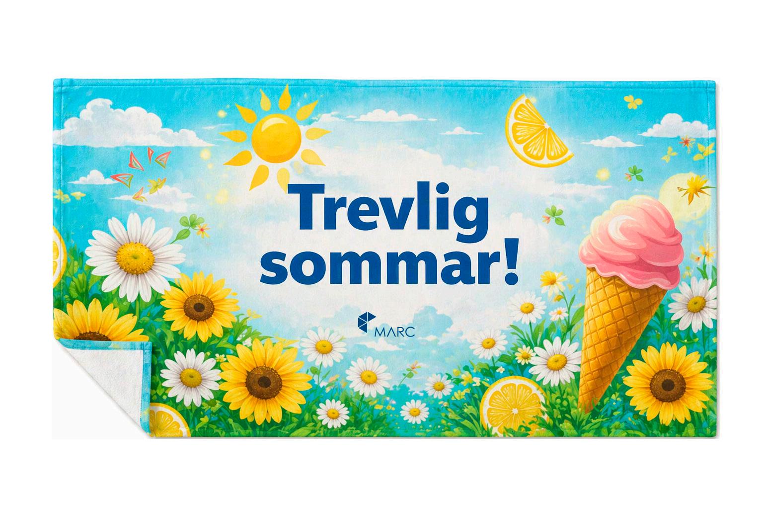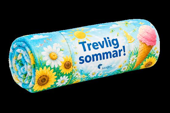 Strandhandduk i egen design i 350gsm, 70x140cm. Ca 4 veckors leveranstid. Min. 199kr/st inkl eget pappersomslag.