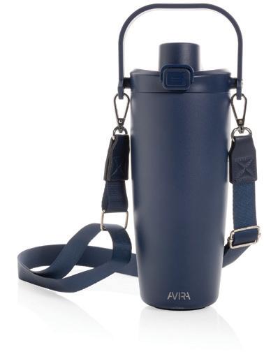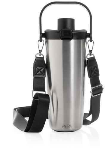 Recycled Stainless steel • Volume 0,72L. • for 5 hours • Keeps cool for 15 hours • Carry loop | 27,4 x Ø 7,5 cm | Pad print 1,92 kg. Benchmark: 3,59 kg. P437.08