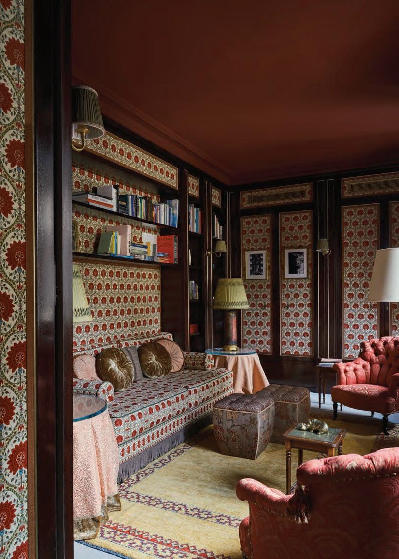 Cuando Theron concibió el departamento como un espacio para recibir clientes y tener reuniones, ella y Porcelli planearon un lounge para fumar puros en un nicho frente a la entrada principal. Cuando la familia decidió mudarse de tiempo completo a Milán, siguió con el proyecto. “Es un cuarto cómodo y sexy donde te dan ganas de ir a fumar un cigarro después de cenar”, comenta ella. Los muros enmarcados en caoba tienen secciones tapizadas con telas florales de la célebre casa textil parisina fundada en el siglo XIX Braquenié, y un sofá a medida cubierto con el mismo algodón exuberante. Un par de butacas tapizadas en capitoné de estilo Napoleón III, forradas en damasco de Braquenié, reposa sobre una alfombra antigua con el borde con patrones geométricos. Un revestimiento en la pared disimula un pequeño baño, de modo que, como bromea Theron, “quienes no logren llegar a casa” puedan pasar la noche en una suite improvisada.