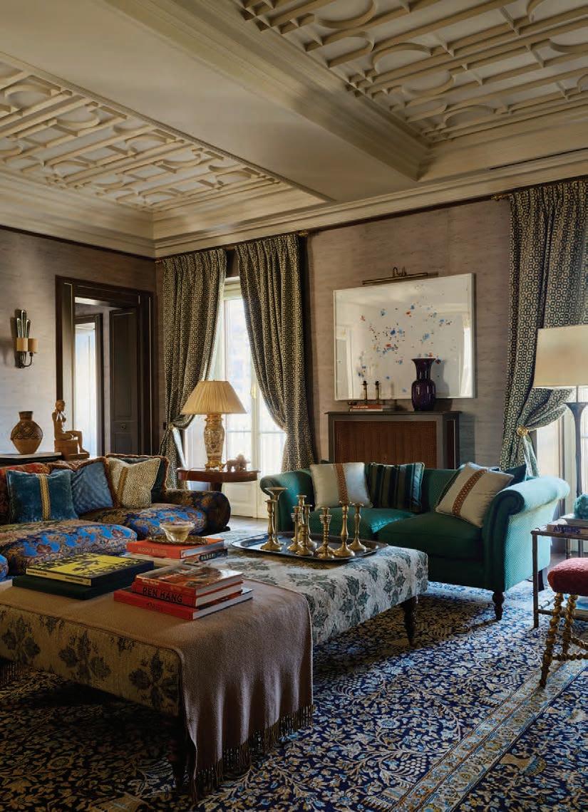 jacquard de algodón azul, rojo, verde y dorado luce una faldilla de flecos dorados. Una lámpara de pie imitación bambú diseñada por Ingo Maurer en 1968 se alza junto a un sofá para dos color verde esmeralda. Sobre la chimenea cuelga un espejo negro y dorado de estilo Napoleón III, cuyas curvas evocan sutilmente el sombrero de un gendarme.