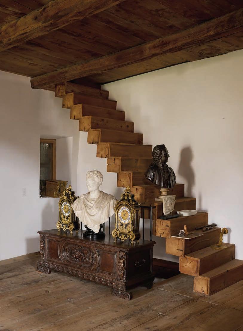 En la galería privada del sótano, la obra en bronce de Arto Monolith, Eiffel Tower (2007), y una variedad de esculturas — Piz Ajüz (2007) en yeso, His Master’s Voice (1992) en mármol negro y Moon (2004) en mármol— por Not Vital. En el arco, un busto de yeso de 1795 del escultor italiano Antonio Canova.