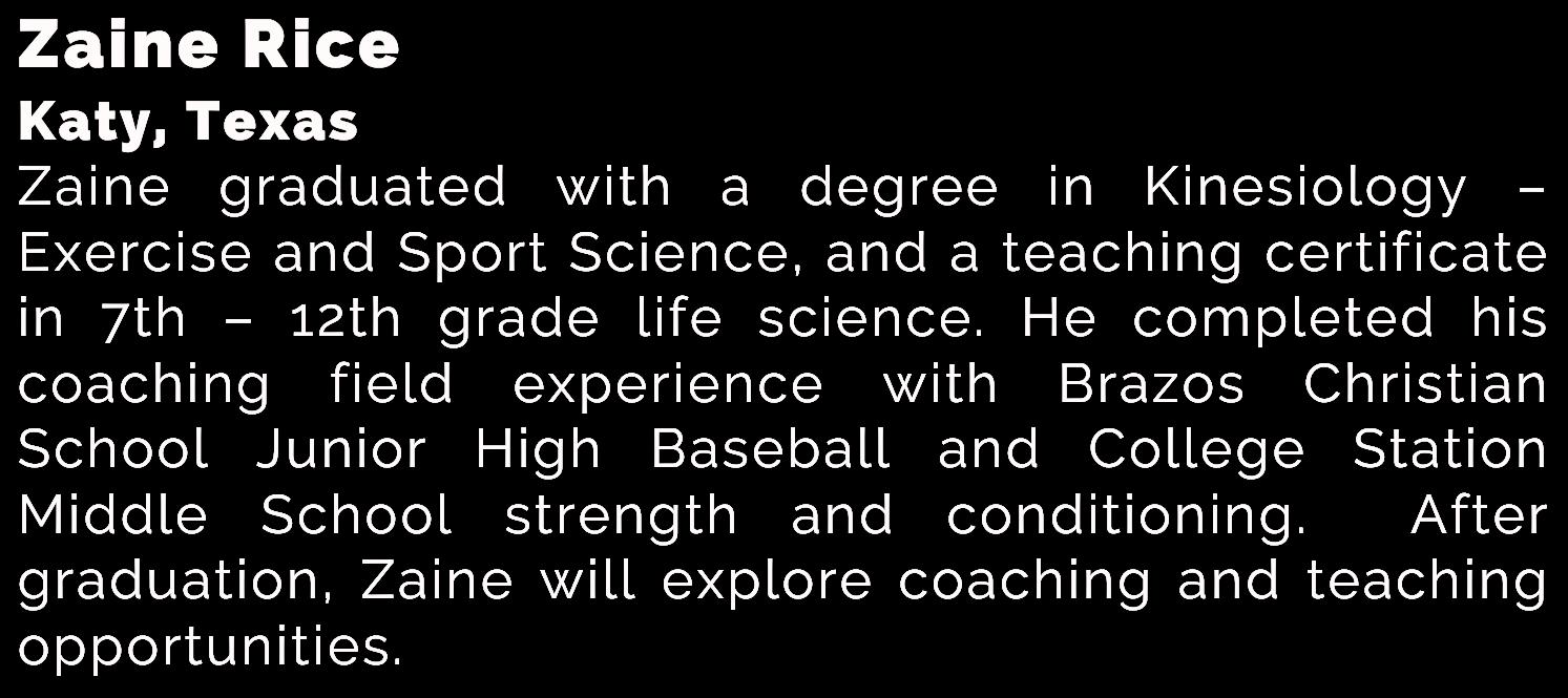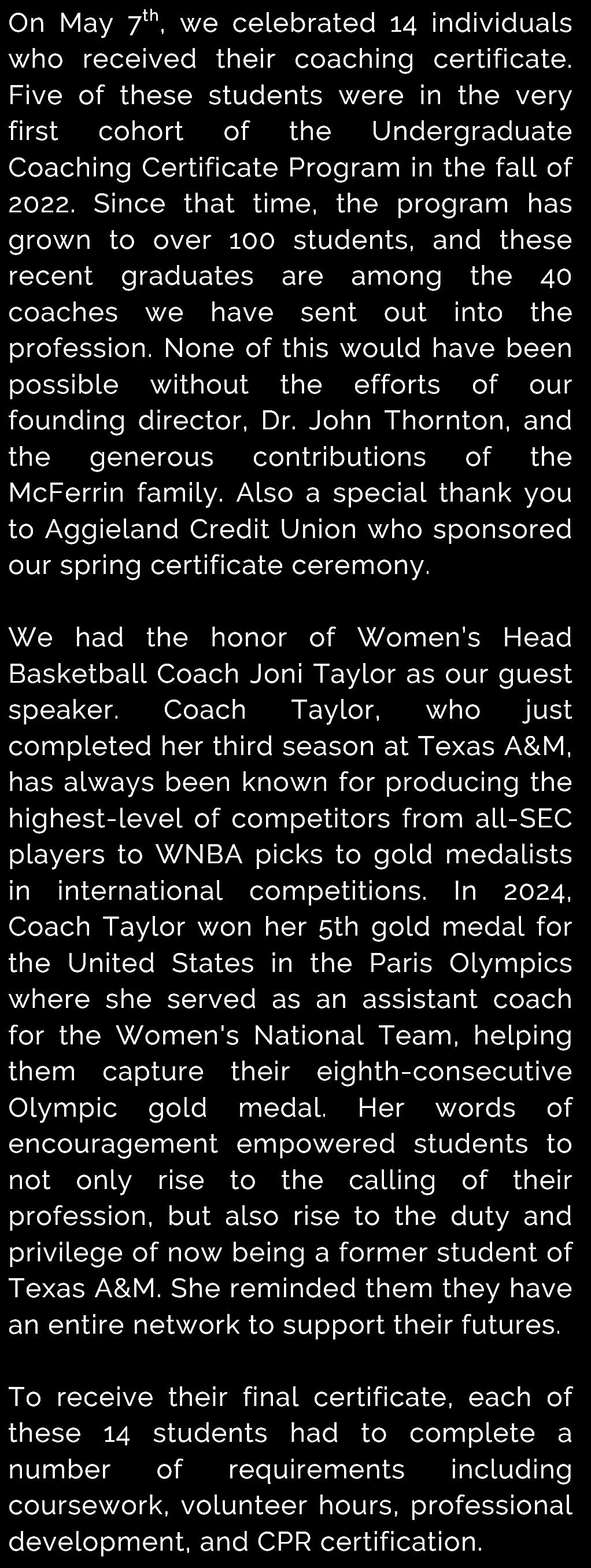 My experience at the Thornton-McFerrin Coaching Academy has been tremendous. It has allowed me to meet people and make connections that I never would have imagined. This experience has equipped me for the next step of my life I have been blessed to work with amazing people that have made life at Texas A&M University something that will be difficult to leave behind. Events such as student seminars, job conventions, THSCA events, and lunches with people within the coaching profession have made a lasting impact on my life for which I am truly thankful Being a Graduate Assistant for this program has allowed me to build meaningful relationships with students throughout Texas A&M. Over the last 2 years, I have seen the Coaching Academy grow tremendously, and I have no doubt that it will expand even more in the future This is all thanks to Michael Thornton, Lindsey Killingsworth, Kelli Campbell, Diane Graham, Alyssa Thomas, Mia Alvarez and everyone that has allowed me to be a part of such an impactful program that is only scratching the surface of what is yet to come – Kendall Downey, ‘25
