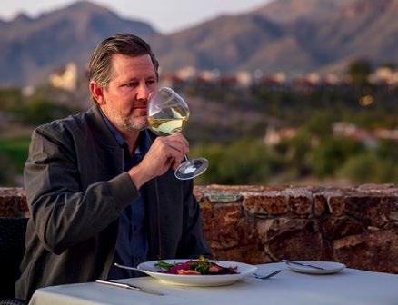Clockwise from left: Sunset dining at Hacienda del Sol; the natural beauty of Ventana Canyon Club and Lodge; the author taking a bunker shot at the Mountain Course; the author at The Wigwam’s Red Course; a scenic vista of The Gold Course at The Wigwam