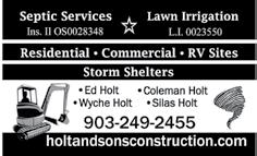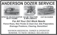 Drainage work, bush hog ging, and backhoe work, culverts, put in driveways and pot holes filled. Under ground water and electric lines. Dump trailer avail able. Vietnam Veteran. 903-640-6999.
