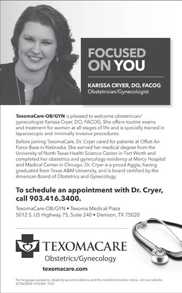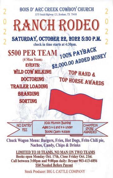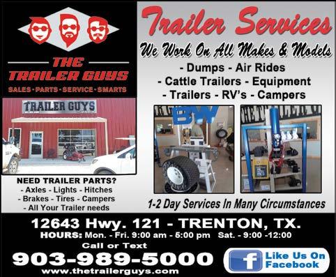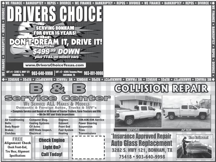 Page 2 • October 11, 2022 5/3/22 Come visit us at either of our locations for amazing daily deals! 2903 B Lee St Greenville, TX 75401 2626 N Center St Bonham, TX 75418 Mention this Ad from The Leader to get a discount off your purchase *excludes fill-a-bag, Saturdays and Sundays* Liquidation merchandise from Amazon, Wish, Target & other multi department stores. Mon - Sat: 10am - 7pm • Sun: 12pm - 6pm (903) 494 - 5097 469-226-3265 903-505-0725 9/14/21 WE CAN GET ANY MATERIAL YOU NEED SO GIVE US A CALL FOR A FREE ESTIMATE Family Owned & Operated - God Bless Hauling: Rock Dirt Sand Asphalt Crushed Granite Excavation Work: Driveways Ponds House Pads Leveling Land Road Base Galyon TravelPlan your world travel or weekend get-away here! Leave the details to us. VacationJurnis.com All Inclusive Resort Packages All Major Cruise Lines • Group Rates (903) 583-0010 Personal Service Paula Galyon Bonham, TX 75418 www.GalyonInsurance.com 1-877-583-0010 Office (903) 583-0010 pgalyon0121@yahoo.com Galyon Insurance Health & Life - Medicare and RX Plans And All Other Personal Insurance Plans • Notary Public We Offer Free Quotes with Over 100 Companies to Save You Money! 5/31/22 Reliance Fasteners OF DENISON LP 115 E. GANDY ST. DENISON, TX 75021 OFFICE: 903-465-0145 FAX: 903-465-0642 JEFF FRANCIS Cell 903-814-3127 jfrancis5419@hotmail.com PAT MILLER Cell 580-920-5575 pmmiller69@aol.com HGP Fencing / Welding Chain link, wood, pipe and barbed wire. Specializing in automatic gates John Davidson III 903.821.2265 Cole Davidson 903.815.0738 davidsoncole566@gmail.com Bring your books to the Bindery for evaluation as 9/7/21 BIBLE and BOOK REPAIR at the BINDERY STOP by For A Free Quote! All work completed @ 1003 N. Center St., Bonham, TX 903-583-3255 Email: info@nationwidebinding.com WE REBIND BIBLES AND OTHER BOOKS! A B BIBLE and BOOK REPAIR at the BINDERY STOP by For A Free Quote! All work completed @ 1003 N. Center St., Bonham, TX 903-583-3255 Email: info@nationwidebinding.com WE REBIND BIBLES AND OTHER BOOKS! C 8/23/22 All Makes and Models Quality Service 469 - 307 - 0493 1348 FM 1552 Leonard, TX 903 - 441 - 3288 Open Mon - Fri: 8 - 4 ||| Sat: 8 - 12 Under New Management 1552 Small Engine Repair & Sales Now Open Parts & Service 9/1/20 North Texas Event