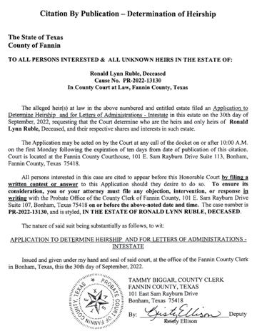 Notice is hereby given that the Commissioners Court of Fannin County, Texas will hold a public hearing starting at 8:50am, Tuesday, Nov 8, 2022. This will be held at the Fannin County Courthouse, 101 E Sam Rayburn Drive, Bonham, TX. All interested citizens of the County are invited to attend and participate in the public hearing. Please check Fannin County’s website under Upcoming Meetings (www.co.fannin.tx.us) up to 72 hours before the meeting for more details.