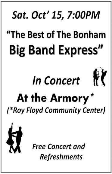 workdays October 15 October 22 October 29 8am - 12pm Bring landscaping tools, carpenters tools, safety equipment, gloves and water. Documented hours count toward “Hours 4 Hours” award. Fannin County Leader Deadline: Thursdays at Noon 903-583-3280 To support activities at the City of Bonham Senior Citizens Center. Become a member of the Friends of Bonham Senior Citizens Center and use your talents to support programs at the Senior Center. For information text Rich at 214-738-9975. Submitted by Rich Summers, President Friends of the Bonham Senior Citizens Center 214-738-9975 Fax: 903-449-4404 rlsummers@reagan.com