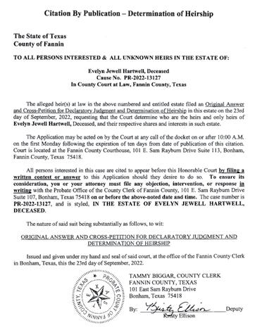 c/o: Michael S. Evans Attorney at Law 308 N Center Street Bonham, Texas 75418