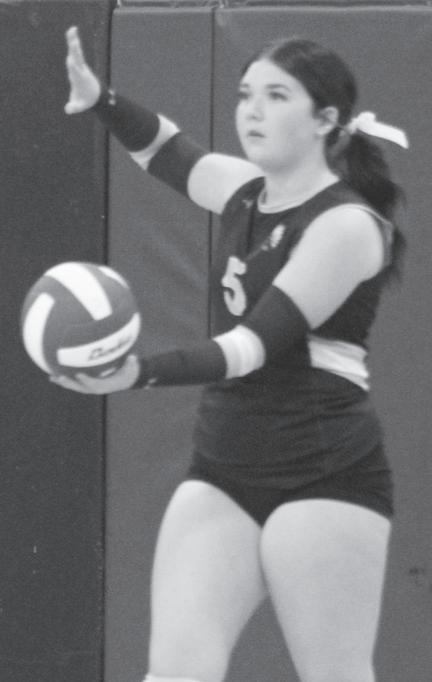 Bonham's Addi Hughes (5) serves on Oct. 3 during District 14-4A volleyball inside Bonham's Leonard A. Gerner Gymnasium.