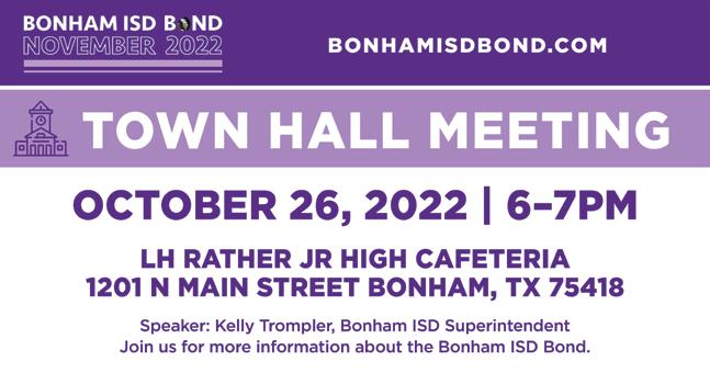 903-821-7663 Tommy Stapleton, OwnerServing North Texas Area Since 1981 07/02/19 www.toproof.net BONDED/FULLYINSURED INSURANCECLAIMSSPECIALIST October 25, 2022 Circulation 15,000+ - Bailey, Bonham, Dodd City, Ector, Gober, Honey Grove, Ivanhoe, Ladonia, Leonard, Randolph, Ravenna, Savoy, Telephone, Trenton & Windom 224 N. Main St., Bonham, TX 75418 fcleditor2020@gmail.com www.fannincountyleader.us Ph: 903-583-3280 • Fax 903-583-3945 The Paper Of Record for Fannin County Texas Serving all of Fannin County For 50 Years Locally owned & operated Classifieds are on pages: 17, 19, 21 Spend just a minute Wisely. Bonham • 120 W. Sam Rayburn Dr. • Bonham • (903) 583-2101 Leonard • 200 W. Collin St. • Leonard • (903) 587-3314 Member FDIC. Equal Housing Lender. NMLS# 400025. © 2021 First United Bank. All rights reser ved. Early Voting October 24thNovember 4th 215 HIGHWAY 75 NORTH, EXIT 69 in DENISON, TX 903-465-5671 • 1-800-951-5671 We Finance • www.blakeutterford.com 1/25/22 All Shop Fox Machines up to 15% off Regular Price! Sale Dates: Oct 24 through Oct 29 OPEN: Mon. - Sat. 7 AM - 6 PM Bonham Building Supply 2430 N Center • Bonham, Texas • 903-583-1874 501272 REG. $1549 SALE $1299 True Value Wild Bird Seed, 20-lb. 100390 SALE $2199 REG. $2499 Bold BBQ Pellets, 18-lb. Valvoline Motor Oil 5W-30, 1-qt. REG. $549 SALE $479 171359 Candle-Lite Candles, 18-oz SALE $799 267505REG. $20900 SALE $18900 DeWalt Mech. Tool Set, 227-pc. TV Lawn & Leaf Bags, 5-pk. 30-gal. 694331 REG. $349 SALE $299 124578 273480 SALE $1499 REG. $1999 NaturalAire Filter, select sizes 149359 SALE $649 REG. $929 GE Clear Heat Bulb, 125WME Digital Timer / Remote REG. $2499 SALE $2099 167411 Bois d’Arc Lake Dedication Event – Reservoirs, Allowing Texas to be Texas
