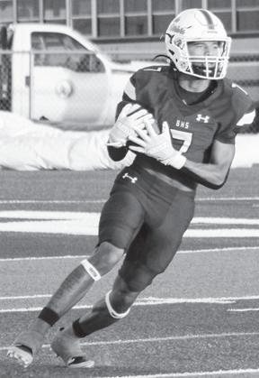Bonham's Brynlee Owens (10) awaits a catch before taking the reception for a touchdown afterward on Sept. 20 during the Purple Warriors' Homecoming game at Warrior Stadium. Photo by Rich Hilliard