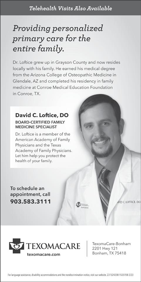 Page 26 • February 21, 2023 • 903-583-3280 WINTER’S ON ITS WAY! We Install Turn Key Kohler & Generac Whole Home Backup Generators Looking for Native American Indians, Alaskan Natives, or Native Hawaiians needing assistance finding employment or vocational training. Must be a member of a U.S. Federally recognized tribe with a supporting document from a U.S. Federally recognized Tribe’s Tribal Rolls and Records office & reside within our designated service area in TX. Call: 1-877-717-6101 or apply online: at www.acwia.org Workforce Innovation and Opportunity Act Section 166, 20 CFR 684.300(a) (1) An Indian, as determined by a policy of the INA program grantee; or (2) An Alaska Native; or (3) A Native Hawaiian. 8/29/17 DALE R. ROSE Car Wreck? Fall? Injured? INJURY LAWYER New Bonham Office: 211 N. Main St. Suite 201 Bonham, TX 75418 Allen Office: 80 E. McDermott Dr. Allen, TX 75002 w www roseknowslaw com dale@roseknowslaw com 972-634-ROSE (7673) 2/21/23 Don’t expect that the other driver’s insurance company is going to take care of you because they won’t unless you know how to get what you deserve. Call Attorney Dale R. Rose as soon as you can and let him fight with the insurance companies for you! He knows how to get you the best results for your injuries! Let him put his 26 years of experience to work for you. Free Consultation – No Upfront Costs! DALE R. ROSE Car Wreck? Fall? Injured? INJURY LAWYER New Bonham Office: 211 N. Main St. Suite 201 Bonham, TX 75418 Allen Office: 80 E. McDermott Dr. Allen, TX 75002 www roseknowslaw com dale@roseknowslaw com 972-634-ROSE (7673) Don’t expect that the other driver’s insurance company is going to take care of you because they won’t unless you know how to get what you deserve. Call Attorney Dale R. Rose as soon as you can and let him fight with the insurance companies for you! He knows how to get you the best results for your injuries! Let him put his 26 years of experience to work for you. Free Consultation – No Upfront Costs! 2 /21/22 Are YOU Tired Of Big Government? RECLAIM SELF-GOVERNANCE Texas HD62 COS Meeting Monday, February 27, 2023 ♦ 6:30 PM Lake Bonham VFW Post 4852 ♦ 1610 Mitchell Dr., Bonham, TX Meeting Topic: Gearing Up For 88; training on online tools for the selfgoverning citizen for the upcoming 88th Legislative Session. Political ad paid for by Brenda Jeter Laura offers balloon decor, flower and candy arrangements, table and chair rental and much more. Laura Ventura 903-486-1395 Check her out on Facebook! Photo by Randy Holland Ribbon Cutting for Balloons & More Free Dementia Education Seminar Hope for Tomorrow Saturday March 4, 2023 8:30am - 3:00pm Reserve your spot today! Bethlehem Baptist Church 1415 Franklin Ave., Bonham Email: info@bethlehemofbonham. net Call Kathy Shockley 214-540-2434 Breakfast & Lunch Provided Kindness is the language which the deaf can hear and the blind can see. ~ Mark Twain Call or Text 911 for Emergency Help Cooke, Fannin & Grayson Counties