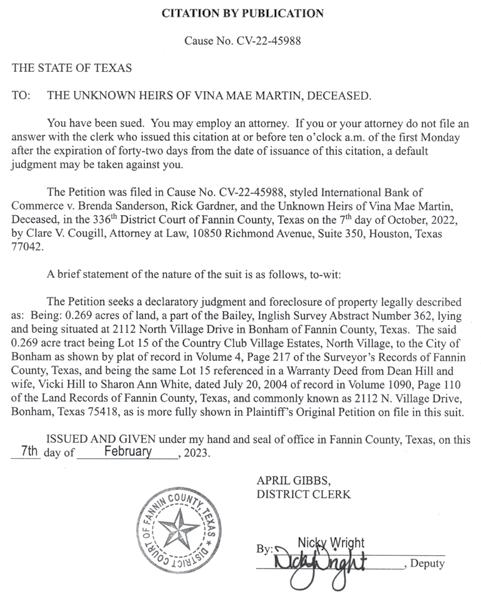 Notice is hereby given that the Commissioners Court of Fannin County, Texas will hold a public hearing starting at 8:50am, Tuesday, March 7, 2023. This will be held at the Fannin County Courthouse, 101 E. Sam Rayburn Drive, Bonham, TX. All interested citizens of the County are invited to attend and participate in the public hearing. Please check Fannin County’s website under Upcoming Meetings (www.co.fannin.tx.us) up to 72 hours before the meeting for more details.