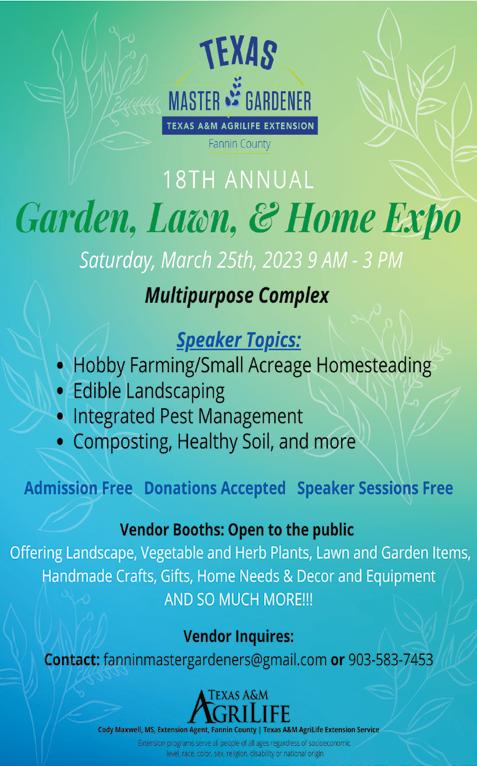 903-821-7663 Tommy Stapleton, Owner Serving North Texas Area Since 1981 www.toproof.net BONDED/FULLYINSURED INSURANCECLAIMSSPECIALIST February 21, 2023 Circulation 15,500+ - Bailey, Bonham, Dodd City, Ector, Gober, Honey Grove, Ivanhoe, Ladonia, Leonard, Randolph, Ravenna, Savoy, Telephone, Trenton & Windom 224 N. Main St., Bonham, TX 75418 fcleditor2020@gmail.com www.fannincountyleader.us Ph: 903-583-3280 • Fax 903-583-3945 The Paper Of Record for Fannin County Texas Serving all of Fannin County For 50 Years Locally owned & operated • Classifieds page 19, 21 • Legals and Emp pages 18, 19, 22, 23, 24, 25 • Obituaries page 20 • Sports page 7 Spend just a minute Wisely. Bonham • 120 W. Sam Rayburn Dr. • Bonham • (903) 583-2101 Leonard • 200 W. Collin St. • Leonard • (903) 587-3314 Member FDIC. Equal Housing Lender. NMLS# 400025. © 2021 First United Bank. All rights reser ved. Check out our Pages 12, 13, 14, 15, 16, 17 Farm & Ranch Section 2/21/23 WE INSTALL & SERVICE GENERAC GENERATORS • FANNIN COUNTY’S ONLY AUTHORIZED GENERAC SALES & SERVICE DEALER Mention our ad to receive a 10% discount on a Precision Tune-Up! Expires: 3/7/23 KEEP WARM THIS WINTER! 903-583-4018 Shop Fox Clearance! 20% off Regular Price! 13-13-13 Fertilizer, 50-lbs. Sale Dates: Feb 20 through Feb 25 OPEN: Mon. - Sat. 7 AM - 6 PM Bonham Building Supply 2430 N Center • Bonham, Texas • 903-583-1874 SALE $3069 683964 WD40 EZ Reach, 14.4-oz. SALE $999 REG. $1349 108199 Green T Fence Post, 6-ft. SALE $849 REG. $999 843060 Snap On T-Post Insulator SALE $1199 REG. $1399 G681034 Suede Mesh Glove, Med SALE $950 REG. $1099 103526 Seed Potatoes NOWCARRYING: Premium Fuel Pellets, 40-lbs. SALE $999 650236 Onion Bunches 50% OFF AllHorseTack Bonham Area Chamber of Commerce Annual Awards Banquet March 11, 2023 Press Release - Save the date for the Bonham Area Chamber of Commerce Awards Banquet, to be held on March 11, 2023 at the Roy Floyd Community Center! The theme for this year’s banquet is “Honoring Our Past, Present & Future” as we continue to celebrate the 175th Birthday of Bonham. From 6pm to 8pm, guests will enjoy delicious selections from Gayle’s as they are serenaded by the jazz quartet,