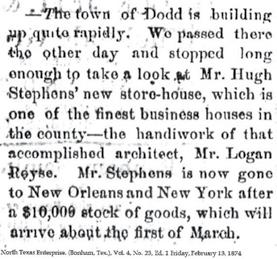 The hotel and store were co-owned by Benjamin Logan Royse and Hugh R Stephens. Mr. Royse was married to the daughter of Hugh, Mary Texalina (Texie) Stephens, and granddaughter of George Stephens of the Stephensville community, now known as Lannius. The Stephens family had several land grants in the area and had a store in Stephensville named “Stephens & Lanius.” That store was broken into on June 2, 1881 per Dallas Morning News 6-3-1881 news clip. The hotel in Dodd City was burgliarized sixteen days later per the Galveston Daily News clip. The Stephens’ married into families like; Biggs, Moore, Wallace, Lanius, Kincaid and Sadler all who became a part of Fannin County and Dodd City history. (more on this in the next article)