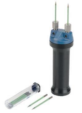 This value is measured using two steel pins, pipe probes (using contact paste), or brush probes. For the designs that are adapted to the different measuring tasks, please refer to our catalogue. Optimum contact between sensor and material is crucial to obtain high reproducibility.