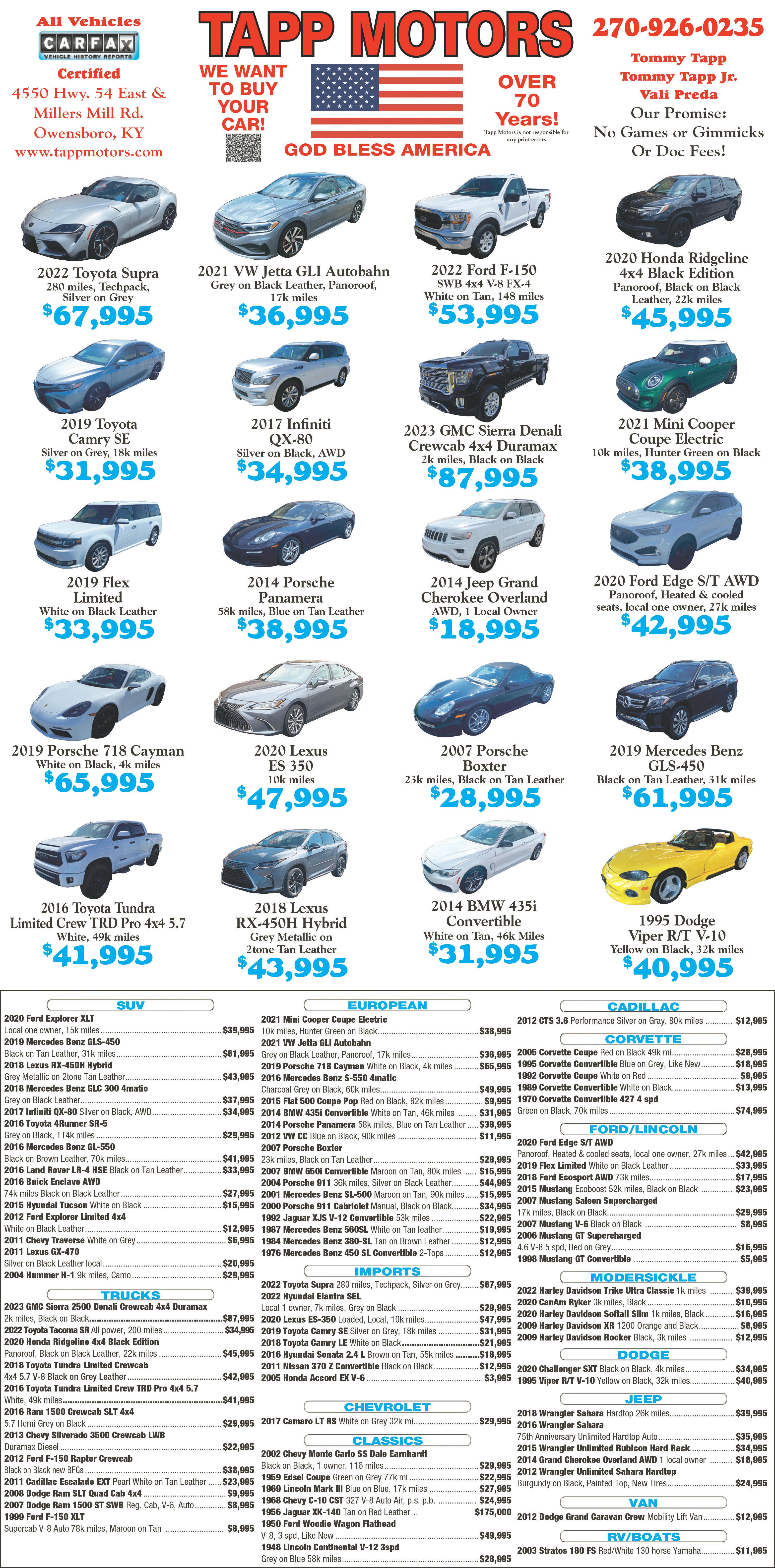 $500 OFF any purchase now thru Jan 31st 2023 (270) 926-4702 killman’s AUTOSALES S 2820 New Hartford Rd. Owensboro • LARGE SELECTION • GREAT SERVICE • DEPENDABLE QUALITY • LOW OVERHEAD MEANS CHEAPER PRICES • LOCALLY OWNED SINCE 1959