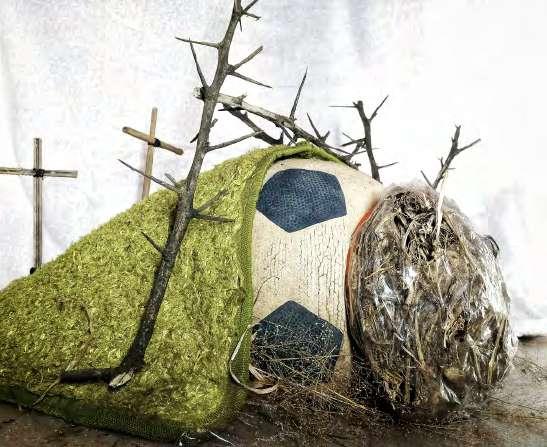 He died for me, it is all about Him. I made an empty tomb + the Cross at calvary, to celebrate the resurrection power of Jesus. Happy Easter friends. I used materials I could find at home, to fabricate the cross of calvary on a hill close to the light beaming tomb, where the Light of the world was laid. The tomb is empty. A unique tomb worthy to be called a Timeless monument. I decided to adorn the entrance of the tomb with the thistles and thorns that was laid on his head, as a reminder of the curse of sin placed on His head for our sake. The light beaming out of the tomb symbolises, The light of the world is alive! He is Alive. The aterial and tools used: Soccer ball, orange tree branches (thistle & thorns), green fabric, pencils as the cross, cutter, cutlass, orange cup, led torchlight, cellotape,