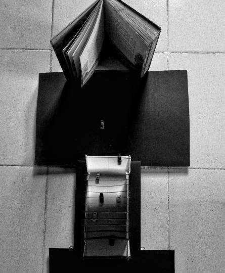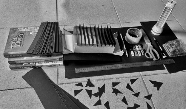 White carton, embossed cardboards, cellotapes, scissors, car miniature models, blade cutter, perforator, torchlight, a book,