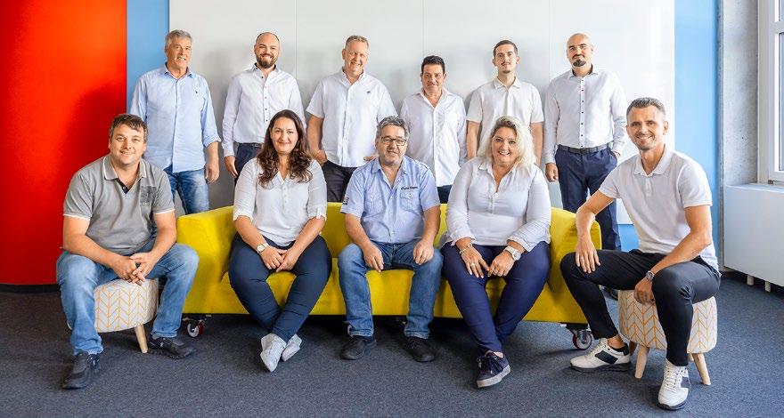 Il nuovo team del Centro di competenza per la tecnica: (dietro in piedi, da sinistra) Dölf Rickenbacher, Dominic Burkard, Patrick Bron, Angel Miguel Martinez Alvarez, Ermin Sadikovic e Dragan Janjic; (davanti seduti, da sinistra) Alain Zingg, Chrissoula Demiros, Roland Plüss, Katrin Schluep e Stanislav Blazanovic.