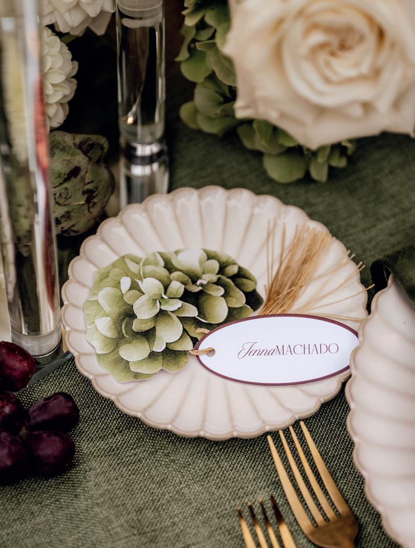 Custom hydrangea-printed name tags and deep red menus provided tailored, tactile details that tied everything together. “Finally, the seating chart – a green velvet backdrop framing the custom-shaped chart – became the transitional design element, visually connecting the tables to the ceremony backdrop and reinforcing the lush, romantic narrative of the shoot."