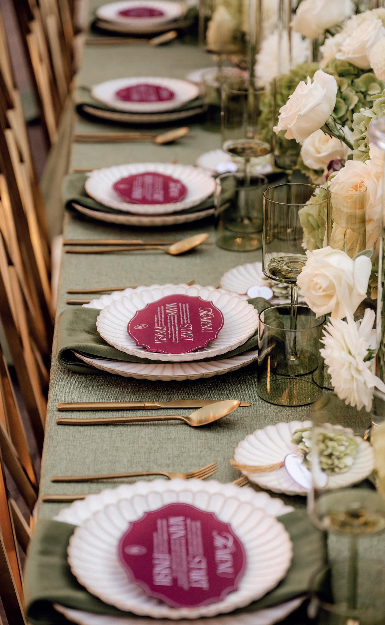 “To bring this concept to life, we began by defining the focal point – the large floral arch – knowing it would anchor the space and set the tone for the rest of the design elements,” he says. Once the floral palette and primary textures were chosen (hydrangea, amaranthus, roses, greenery, linen and velvet), the tablescape was built around them: gold chairs and cutlery to warm up the palette, white scalloped dishware for softness and structure, green glassware to bridge the floral hues and tall candelabras to introduce verticality that mirrors the arch.