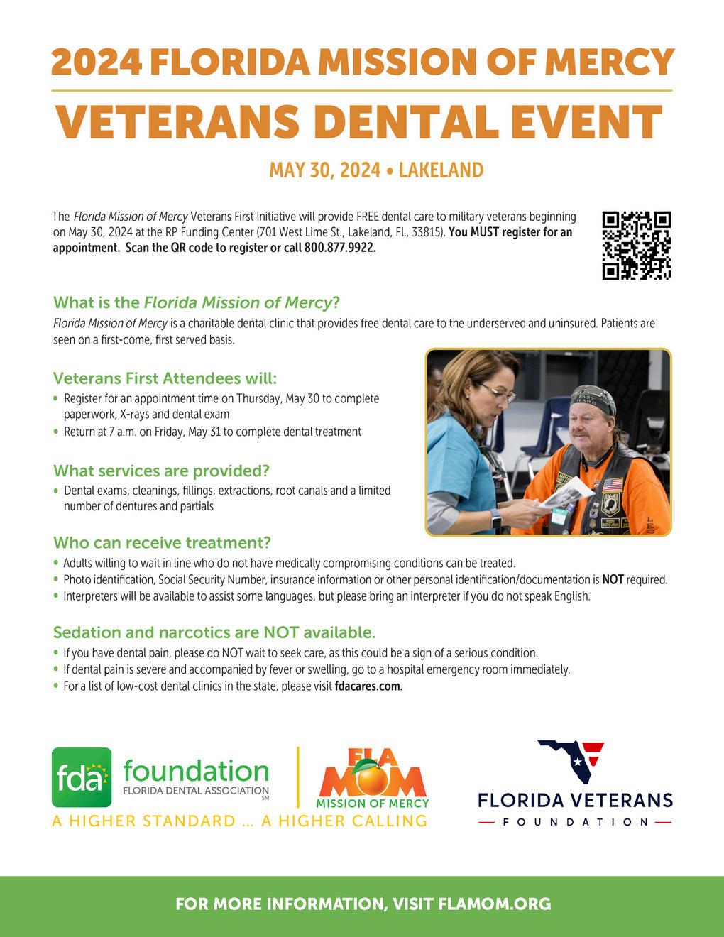 Florida Mission of Mercy (FLA-MOM) is a large-scale, two-day, professional dental clinic that provides care at no cost to the patient. The program’s goal is to serve the underserved and uninsured in Florida those who would otherwise go without care.