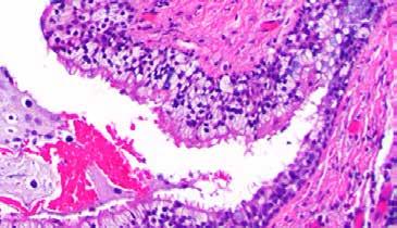 Correct. Glandular odontogenic cyst (GOC) is a rare developmental odontogenic cyst that most commonly affects middle-aged adults and shows a strong predilection for the anterior mandible, often crossing the midline. Radiographically, it may present as a unilocular radiolucency when small, though large lesions are almost always multiloculated. GOCs are frequently associated with cortical expansion and root resorption, though roots were intact in this case. Histologically, GOC is characterized by nonkeratinized stratified squamous epithelial lining with glandular features such as mucous cells within the lining, intraepithelial microcysts or duct-like spaces and hobnail or apocrine “snouting” of the epithelial cells (Figs. 3 and 4). Pseudostratified ciliated epithelium is frequently present within the lining. Due to its locally aggressive behavior and high recurrence rate, surgical management frequently involves marginal resection for complete excision of the entire lesion with clean bony margins. Long-term follow-up is highly recommended.