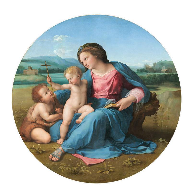 Chúa Con. Họ nhìn chúng ta với vẻ mơ màng vì sự ngọt ngào, bao hàm sự hướng nội mà ta thường thấy ở tranh của Leonardo hơn. Phía sau nhân vật này là phong cảnh của nông thôn, rồi nổi bật lên hình ảnh một nhà thờ nằm cheo leo trên đỉnh đồi. Về sau, ông quay về với đề tài Thánh Nữ và Chúa Con nhiều lần, và mỗi lần lại có một bố cục thanh lịch khác nhau. Bức “Đức Mẹ Alba”, trái lại có hơi hướng hùng tính của Michelangelo, tuy vẫn dịu dàng như phong cách của Raphael. Cảm xúc được nâng