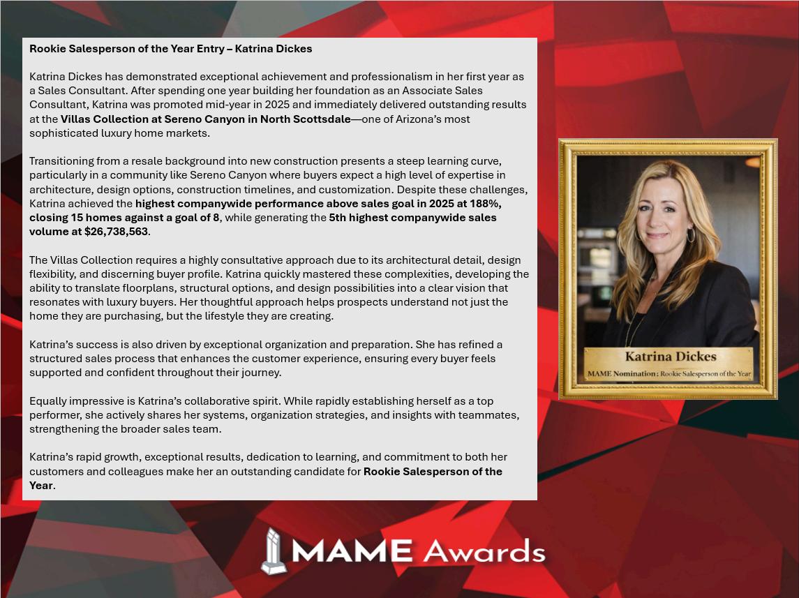 Katrina Dickes has demonstrated exceptional achievement and professionalism in her first year as a Sales Consultant After spending one year building her foundation as an Associate Sales Consultant, Katrina was promoted mid-year in 2025 and immediately delivered outstanding results at the Villas Collection at Sereno Canyon in North Scottsdale – one of Arizona’s most sophisticated luxury home markets