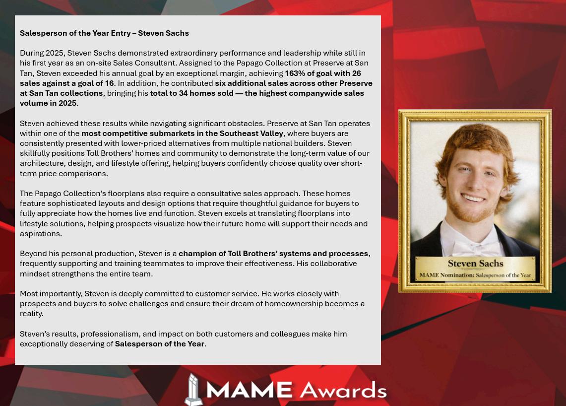 During 2025, Steven Sachs demonstrated extraordinary performance and leadership while still in his first year as an on-site Sales Consultant Assigned to the Papago Collection at Preserve at San Tan, Steven exceeded his annual goal by an exceptional margin, achieving 163% of goal with 26 sales against a goal of 16 In addition, he contributed six additional sales across other Preserve at San Tan collections, bringing his total to 34 homes sold – the highest companywide sales volume in 2025