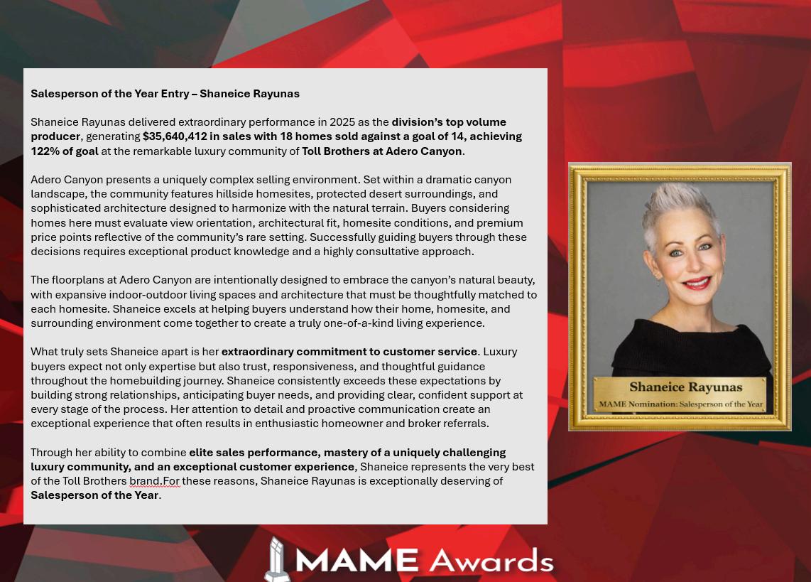 Shaneice Rayunas delivered extraordinary performance in 2025 as the division’s top volume producer, generating $35,640,412 in sales with 18 homes sold against a goal of 14, achieving 122% of goal at the remarkable luxury community of Toll Brothers at Adero Canyon.