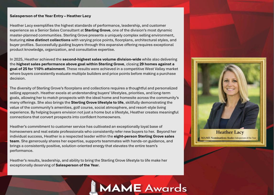 In 2025, Heather achieved the second-highest sales volume division-wide while also delivering the highest sales performance above goal within Sterling Grove, closing 29 homes against a goal of 25 for 110% attainment These results were achieved in a competitive West Valley market where buyers consistently evaluate multiple builders and price points before making a purchase decision.