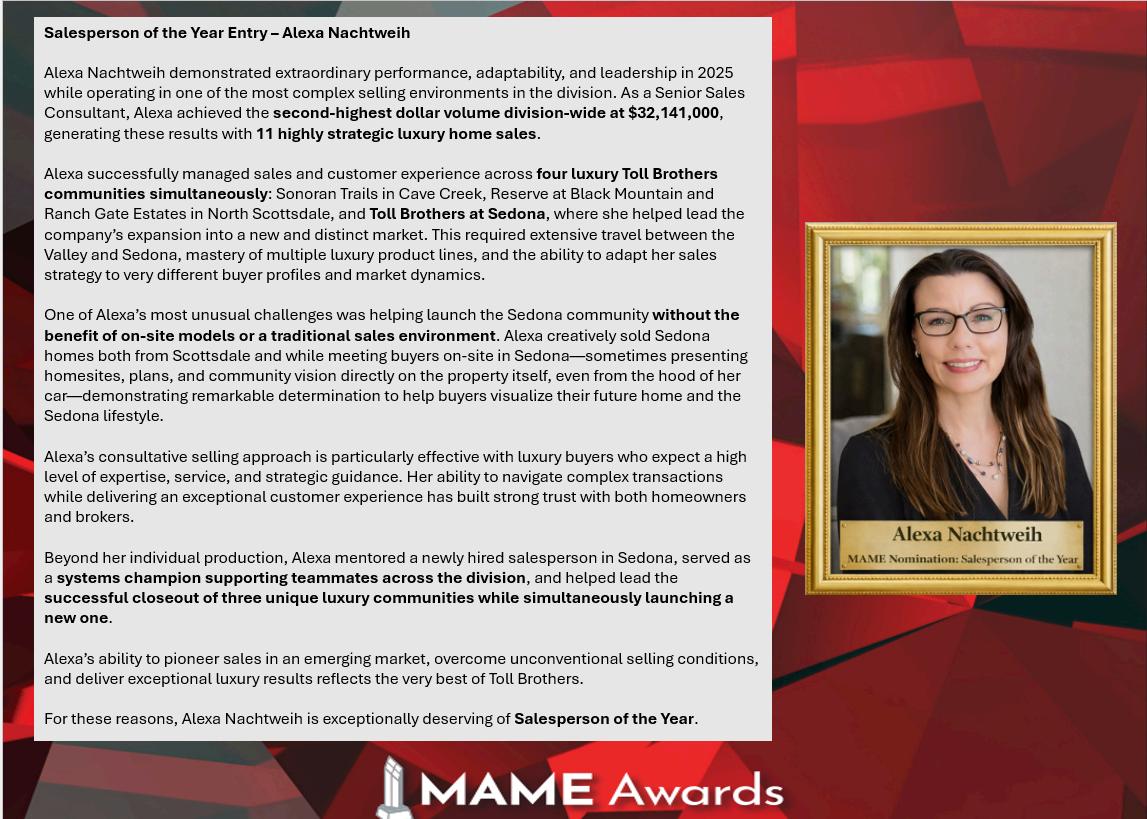 Alexa successfully managed sales and customer experience across four luxury Toll Brothers communities simultaneously: Sonoran Trails in Cave Creek, Reserve at Black Mountain and Ranch Gate Estates in North Scottsdale, and Toll Brothers at Sedona, where she helped lead the company’s expansion into a new and distinct market This required extensive travel between the Valley and Sedona, mastery of multiple luxury product lines, and the ability to adapt her sales strategy to very different buyer profiles and market dynamics.