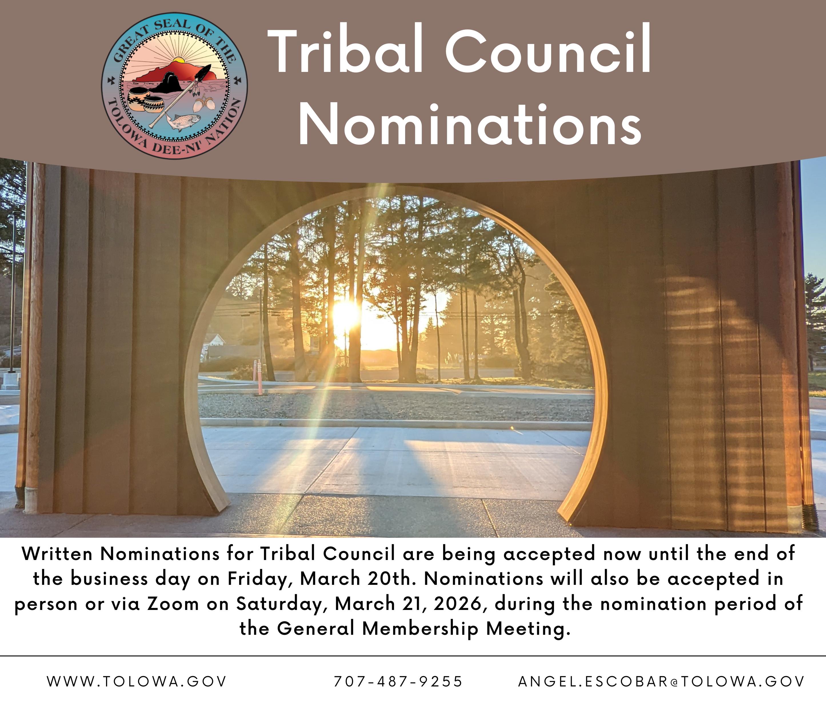 Taa-xee Num-nii~-ma~s (March) 2026 Tribal Government Newsletter published by the Tolowa Dee-ni' Nation, 12801 Mouth of Smith River Road, Smith River, CA 95567. Find our website at tolowa.gov. Articles do not necessarily reflect the opinions of the Tribal Council of the Tolowa Dee-ni' Nation or their staff. The Tribal Council of the Tolowa Dee-ni' Nation reserves the right to use their discretion in the information they publish. As per the Tribal Council of the Tolowa Dee-ni' Nation, no article shall be published or acknowledged in the tribal newsletter that does not promote and protect the best interests of the Nation. For information, contact Public Information Officer Scott Graves at scott.graves@tolowa.gov, call 707-487-9255.
