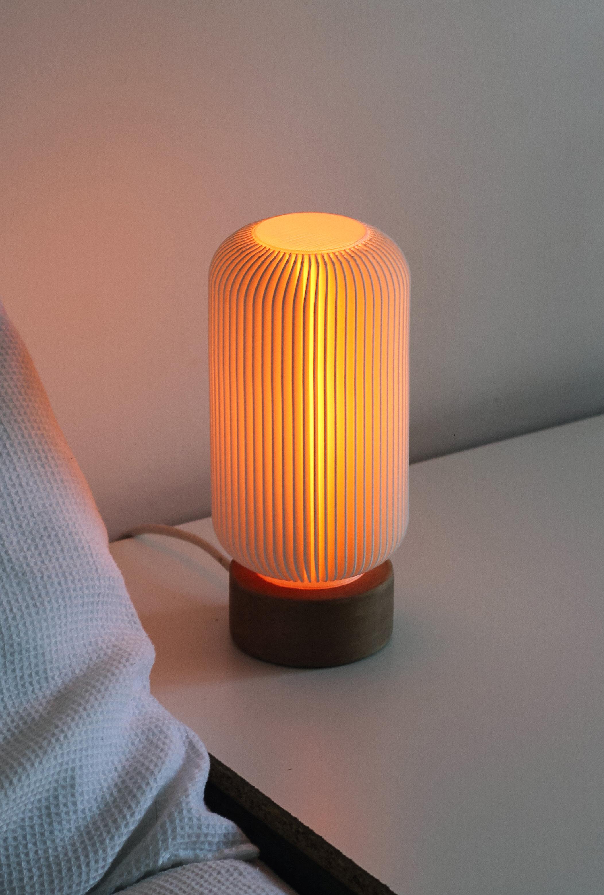 The result was a tall cylindrical bedside lamp featuring intricate fin designs. Emitting a soft glow, the lamp’s design includes small gaps between each fin, allowing for light leaks that vary in intensity, creating an intriguing lighting effect. I find this aspect compelling and would like to explore it further. The lamp is supported by a hardwood base, housing most of the electrical components and providing a substantial, quality feel to the product. Freelance/ Lamp