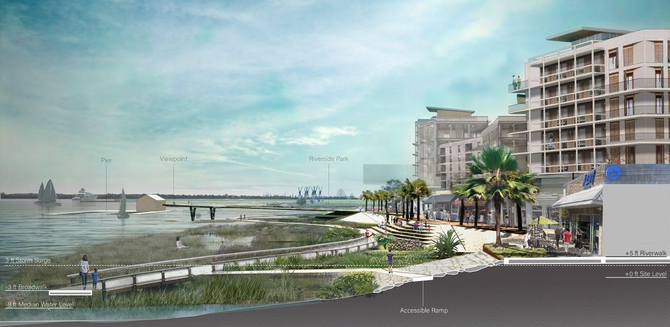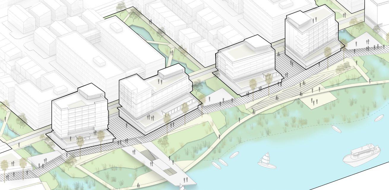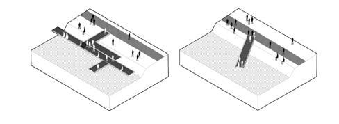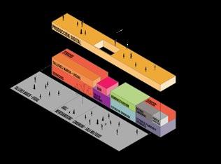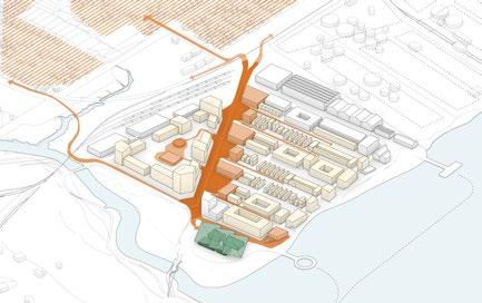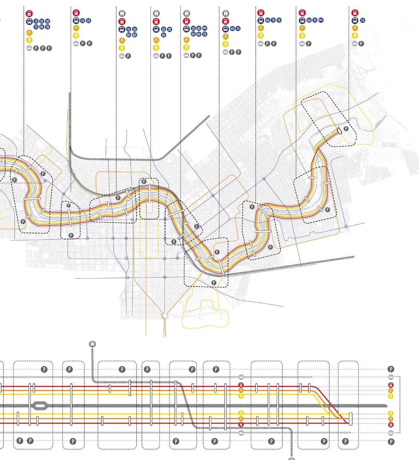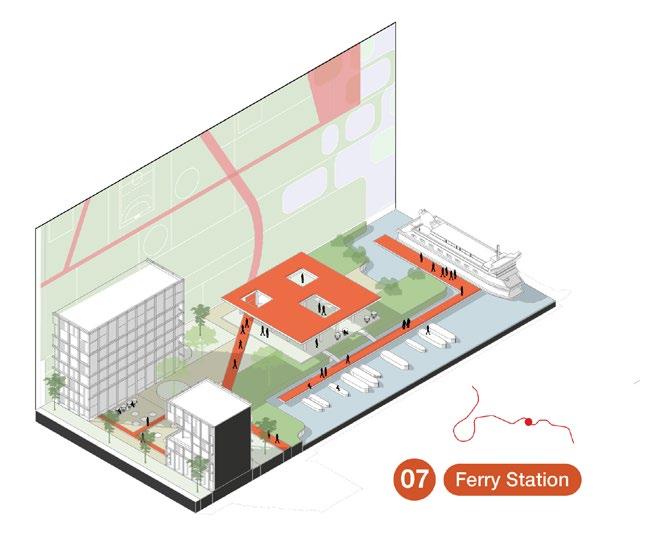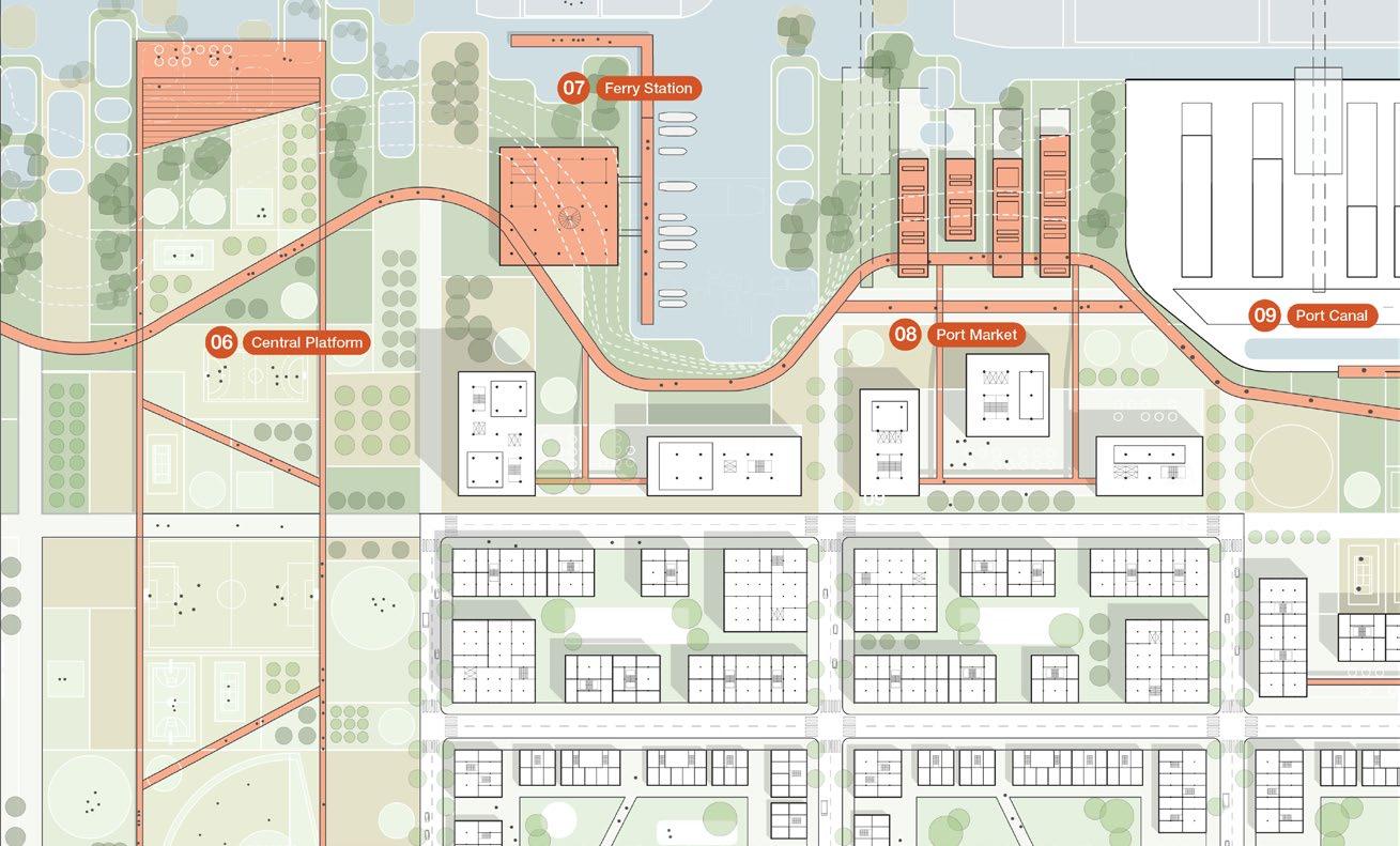 These strategies are intersected by a new axis on the first street, including a light train system for a fast connection to downtown, and it is also intersected by the new waterfront pathway, which we call the waterfront bracelet. Throughout the waterfront, the bracelet considers the post industrial identity of the site, with some remaining structures like electrical grids and cranes, and combines them with new programs, like markets, playgrounds and stations.